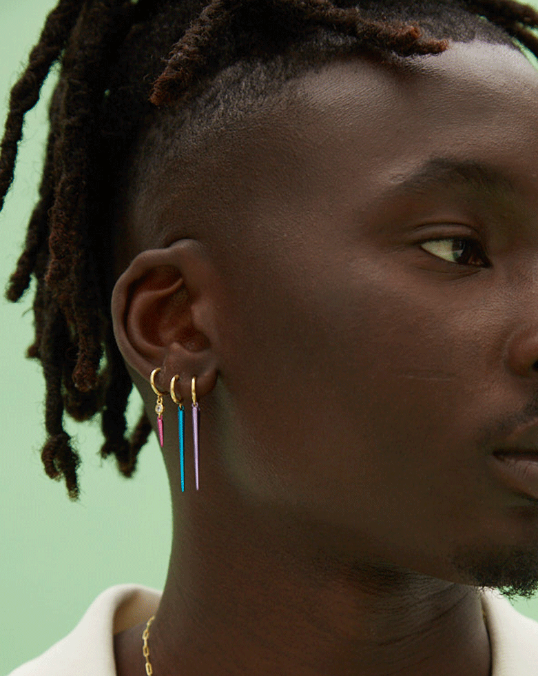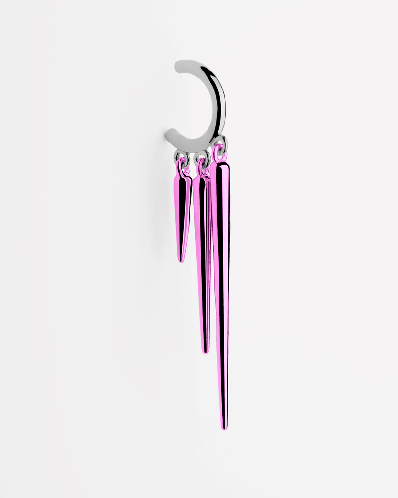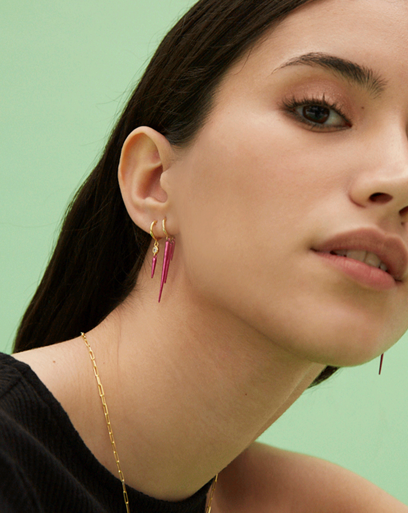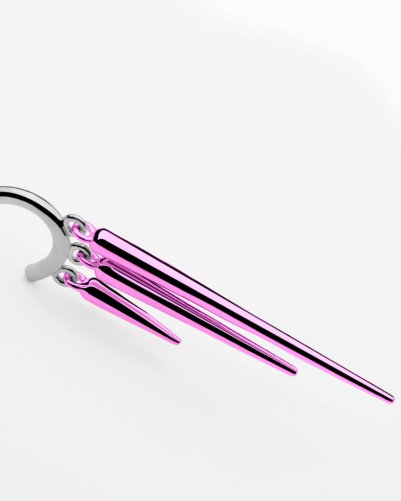 Add edgy glamor and charm threefold to your next dress-up outfit and be stylish in your fashion with the Pink Gold Spike Hoop Earrings. The pink spike earrings for a dramatic addition to any feminine look with an edge. Made from 18k gold plated 925 sterling silver, the faceted shiny polished 3 pink spikes of these triple spike earrings lend them triple interest and style. A fun, unique pair of pink gold triple spike earrings for the bold and fashion-forward woman.