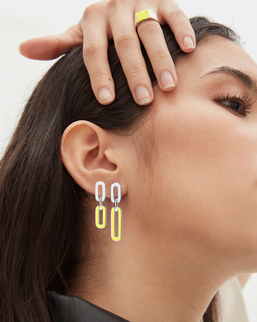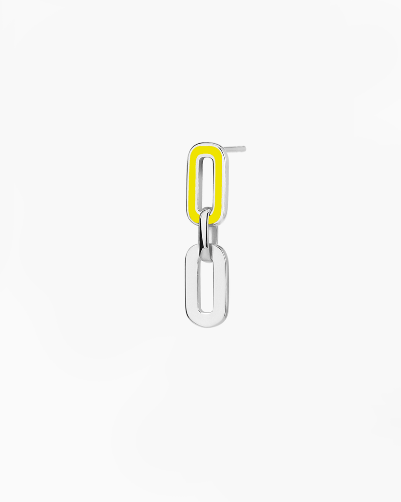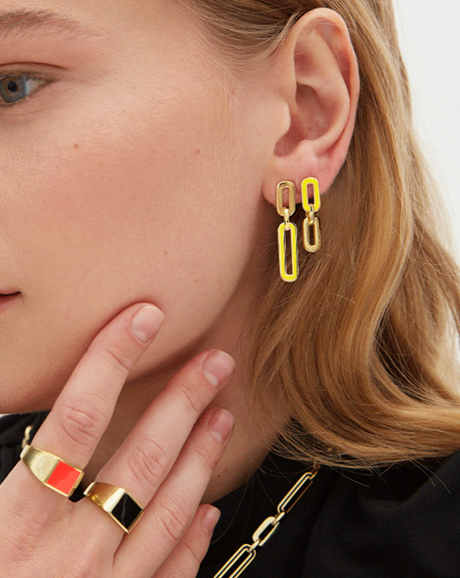 Exquisitely crafted from high-quality 925 sterling silver dipped in 18k gold and yellow enamel, the double chain-link earrings feature an alternating double-link design to rub off double charm and glamour on your outfits.